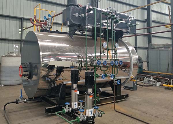 WNS低氮冷凝式燃氣蒸汽鍋爐,采用全濕背回燃室,回燃室與后管板扳邊對接,鍋爐采用全對焊接,質量更可靠。該鍋爐燃燒室由大直徑全波紋爐膽組成,燃燒空間大,燃料燃燒完全,有效吸收熱膨脹,輻射受熱面大。為提高熱效率,該型鍋爐前煙箱出口處依次布置有節能器、冷凝器,其節能效果顯著。